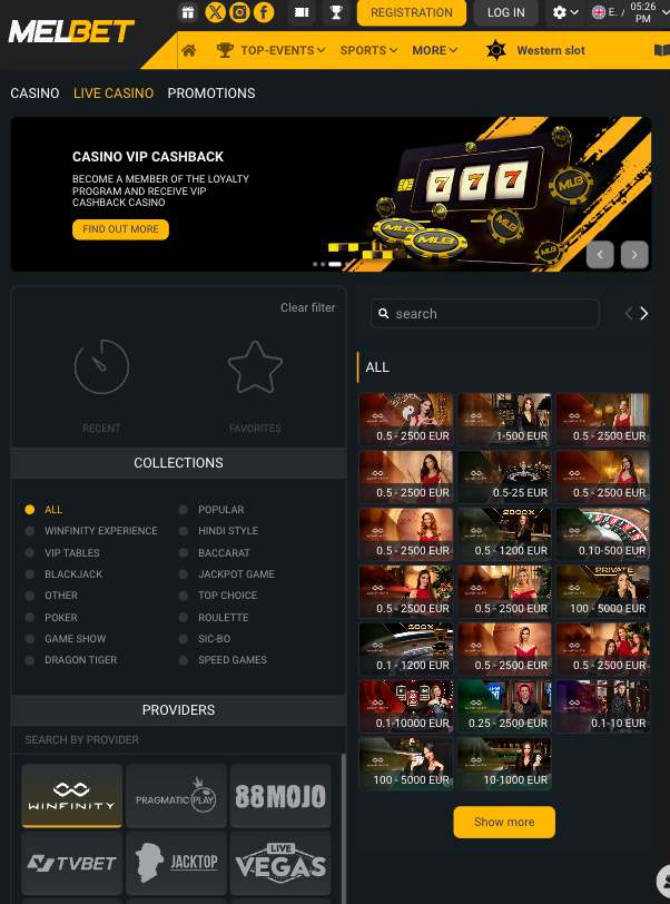 Popular live dealer games at Melbet online casino include: